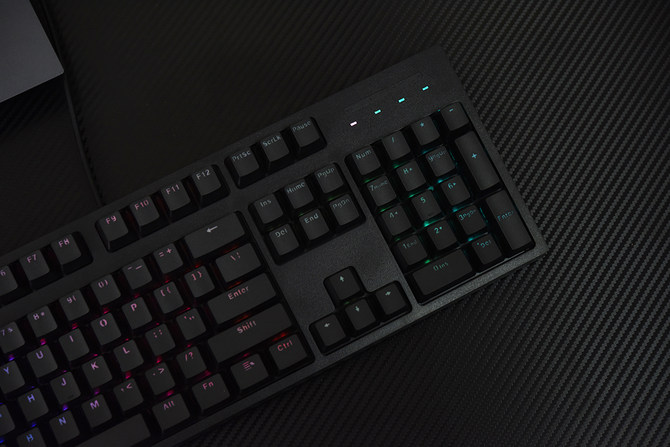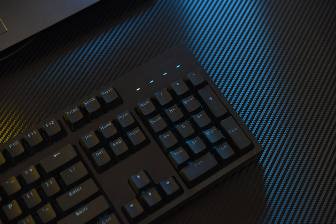 小键盘上方为指示灯区域,分别指示小键盘锁定、win键锁定、大小写等功能,同时雷柏V808RGB具有全键可编程功能,可以通过驱动将顶部多媒体按键进行自定义设置。