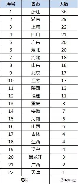 具有保送生资格的五大学科竞赛国家集训队队员共分布在22个省市,其中浙江省最多,共计36人,我省3人,其他省市保送人数统计见下表: