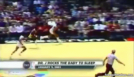 再看一个球。这个众所周知:J博士篮板后滑行上篮。
