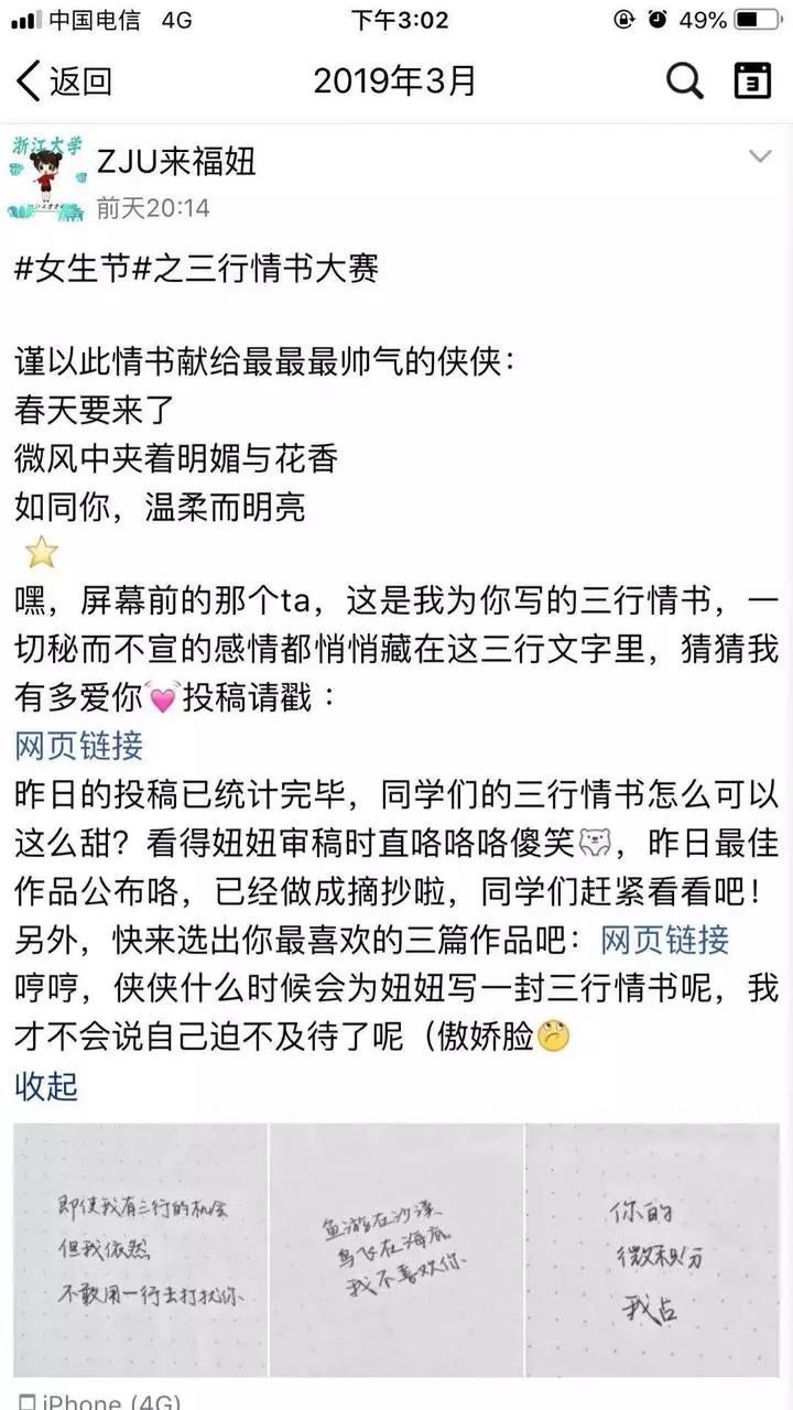 3月7日是女生节,浙江大学学生会主办了一系列“女生节”活动,“三行情书”就是其中之一。“虽然是今年第一次举办,但同学们的参与情况来看,反响相当不错。”参与主办活动的校学生会成员童一颖告诉记者。参与者有一周的时间写作投稿,截至昨天,累计已收到271份投稿。