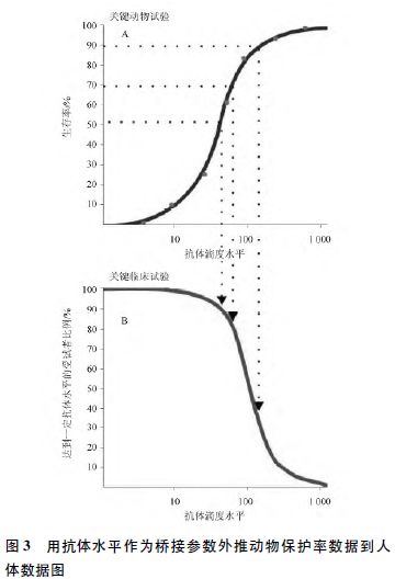 在假设动物和人的抗体保护效力无种属差异的前提下,可通过考察疫苗诱导的动物免疫反应指标( 如生存率) ,采用可反映机体免疫反应水平的指标( 如抗体滴度) 桥接动物和人体的保护效力,最终量化预测疫苗的临床保护率。