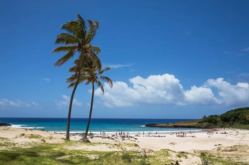 位于阿纳凯白沙滩(Anakena Beach)的摩艾石像则带给人完全不同的感受。这里是复活节岛上唯一的白色沙滩,已经被修复的七座摩艾石像 Ahu Nau Nau 被珊瑚砂环绕,四周椰林婆娑。不仅游客,当地人也喜欢来此享受椰林海风白沙滩的休闲轻松。