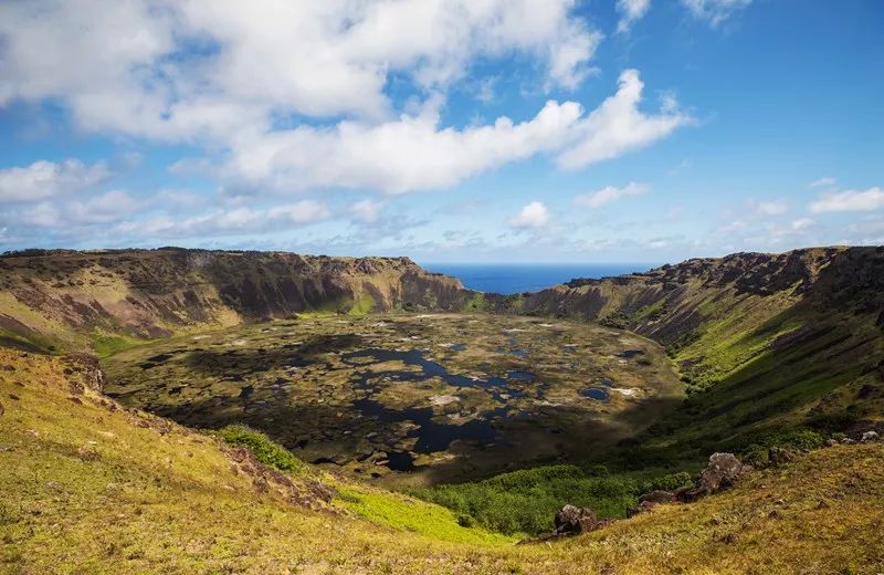 我们来到岛上最大的火山口——位于复活节岛西南角的拉诺廓(RANO KAU)火山口。早在 250 万年前,这座火山就已经塑造了岛屿西南部的轮廓线。我沿着 300 米高的悬崖边缘转了大半圈,下面是一个海拔 200 米的火山口湖,蓝色的湖面漂浮着芦苇,蓝绿相间煞是好看。据说,这个湖是全岛的水源所在。