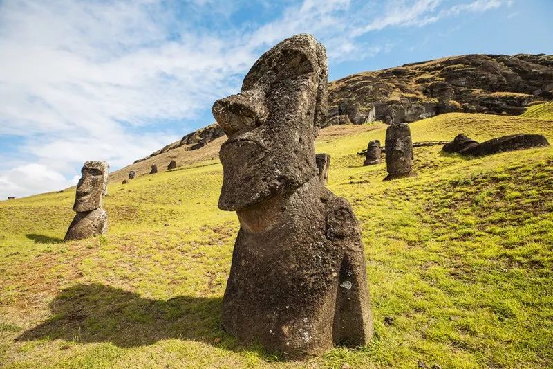 关于石像的来历一直存在争议。有人说出自外星人之手,而更普遍的说法是出自古波利尼西亚人之手。采石场的遗迹或许可以应证这种说法:位于海边不远处的山腰上,这里横七竖八躺立着各种尚未完工的石像,它们以整块火山岩为材料被雕刻出来,人们甚至还发现用玄武岩制作的当地人称为托其(Toki)的石斧,无比坚硬。