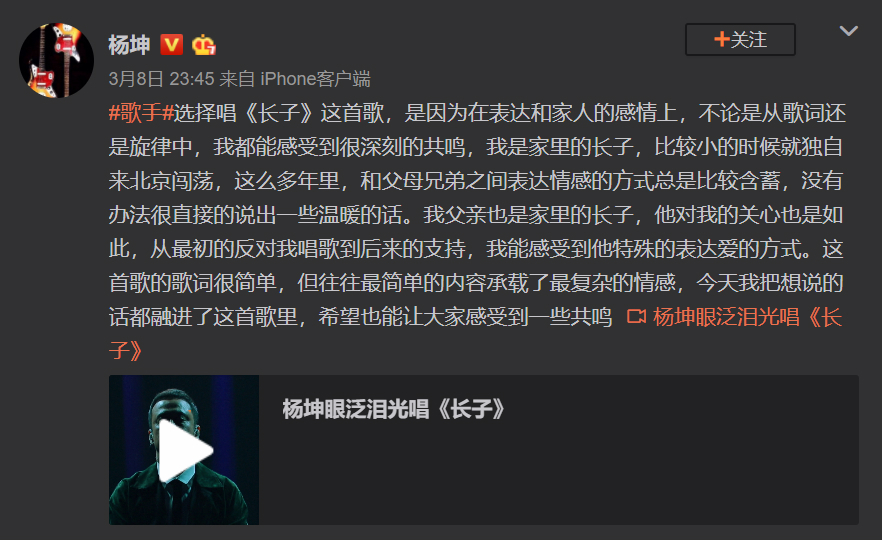 娱乐讯 内地星娱 备受瞩目的国内王牌音乐竞技综艺节目《歌手》第九期于3月9日晚10点在湖南卫视震撼播出。在这场终极踢馆赛上,新老歌手同台飙歌,为大家奉献了一场绝佳的音乐视听盛宴。上周温柔献唱《真的很在乎》的杨坤,本期再次延续深情,眼含泪光献唱了彝族歌手JIHU(吉胡)的原创作品《长子》。舞台上的他,白色衬衫搭配墨绿色长款风衣,简约有型。极具魅力的坤式烟嗓搭配空灵纯净的童声合唱,把一首韵律感十足的歌曲唱得细腻动人,淋漓尽致地诠释出了歌词中蕴含对父亲满满的爱意。杨坤的完美表现再次感动全场听审和歌手,成为第九期周冠军,也是第二位得过三次周冠军的竞演歌手,该曲被众网友誉为 本季《歌手》最佳 。