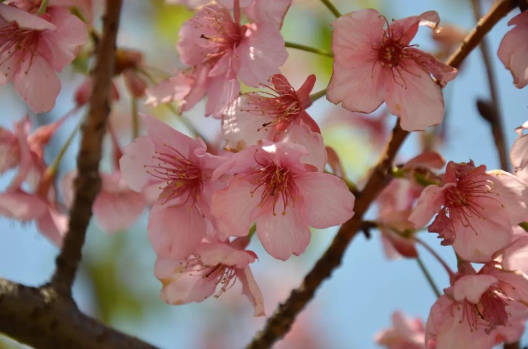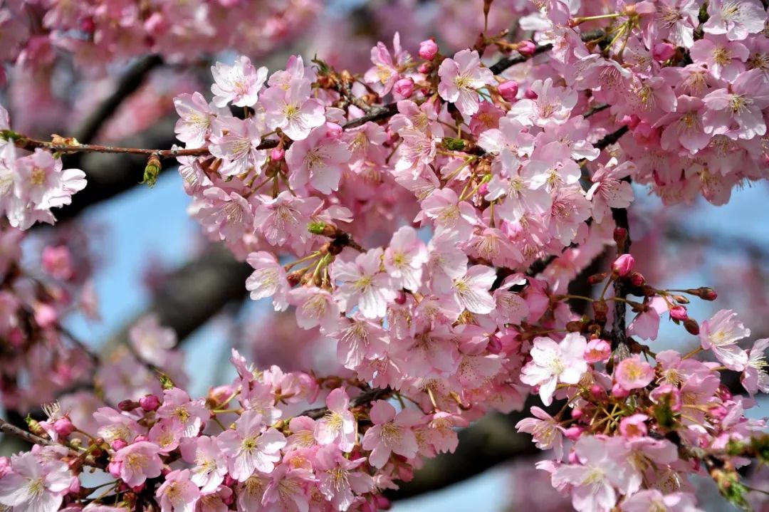 河津樱的粉色是所有樱花品种里最粉嫩的,既不淡也不艳。早上,光源充沛的情况下,将脸靠近花朵拍摄,不开美颜拍出的脸色,也像樱花般粉嘟嘟有光泽。