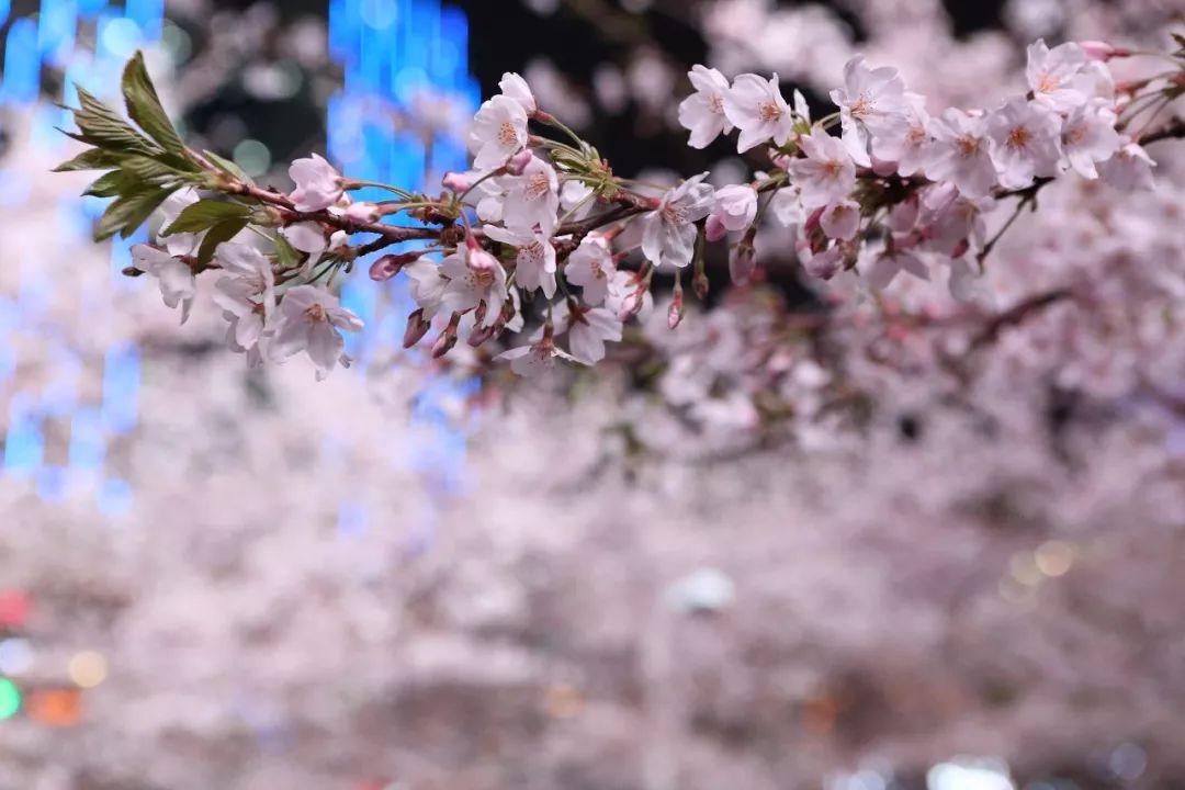 晚上,虹口体育场的大灯光依然为樱花打call,吉野樱的花瓣在白炽灯下更加透明。