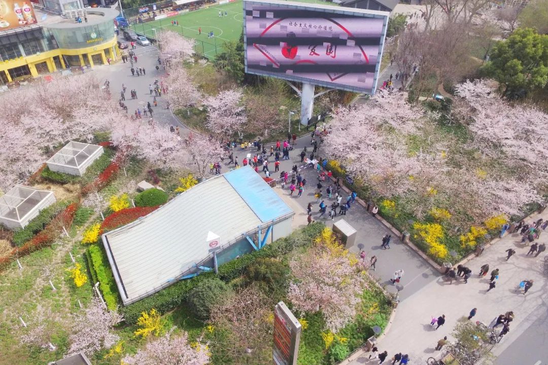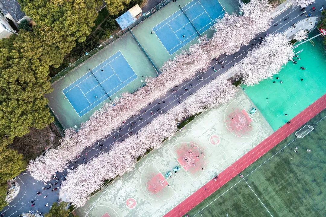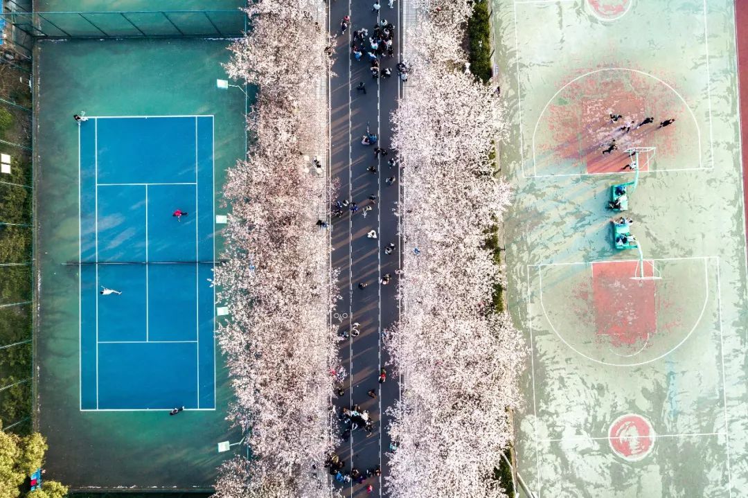 樱花道周围散发着浓浓的青春气息。若能偷偷溜进大道旁的教学楼,到楼顶拍到一张上帝视角的樱花海,刷爆朋友圈。