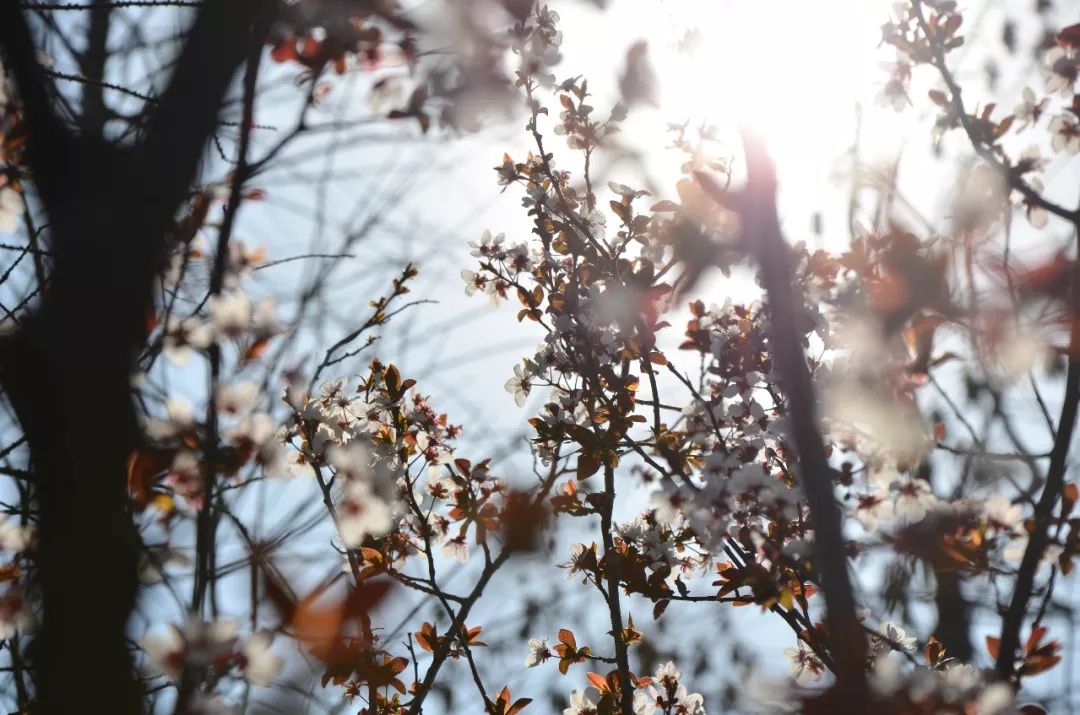 几株有年头的白色日本樱分散在公园大门口、樱花林对面,比樱花林里的晚樱开得早。若是遇到同期开花,幸运降临。