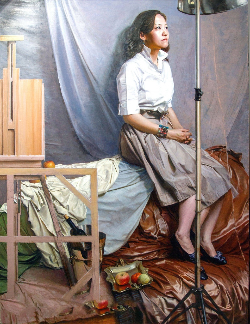 这幅画里他的女儿梳着利落短发,穿着白衬衣和半身裙,优雅的坐在工作室的台布上,凝视着远方。这幅画无论构图,色彩,塑造都是没得说的。比起李壮平的女儿,这幅画里女儿应该成熟一些,有故事一些。