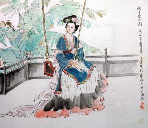 想得那人垂手立,娇羞不肯上秋千。