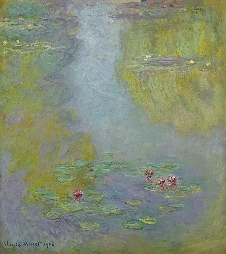 晚年的莫奈开始了《睡莲》系列的创作,展厅中这幅是他68岁的作品。他曾说:“睡莲可以让我体会到无限的感受,构成宇宙的诸多要素,以及在我们眼前变化不息的宇宙,仿佛化为了一个小宇宙,存于睡莲中。”