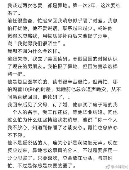 猫仔Em:异国快三年,每年见一次,一次两星期。他在美国读博,唠叨抠门,我在国内工作,中度抑郁。每天视频打电话,几乎时刻微信,他晚上睡觉不关声音,总担心我出意外。我睡觉也不关机,抑郁症使我易惊醒,会第一时间打电话给他。每次接机见面,会有初恋心悸的感觉。