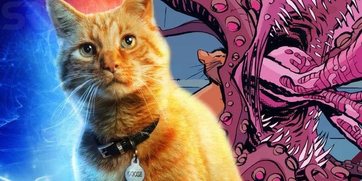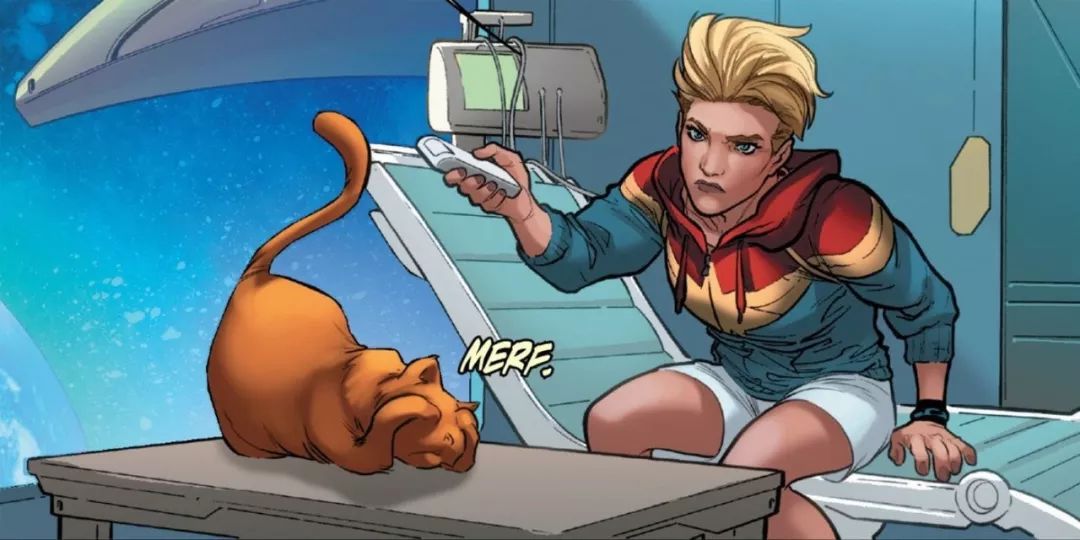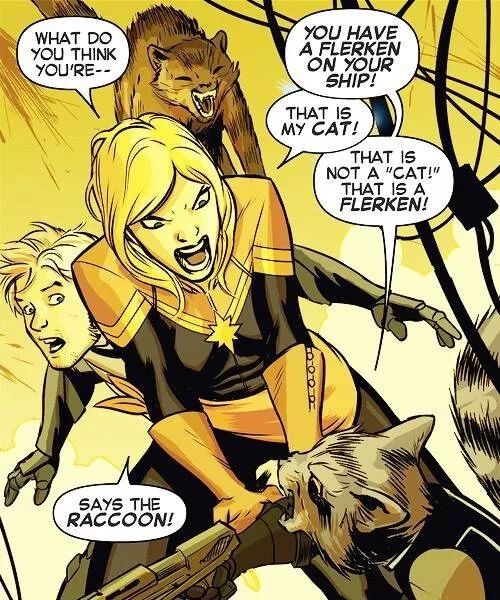 漫画里惊队一直只把它当一只普普通通的橘猫,直到2014年,《惊奇队长》第一期里,惊队遇上了银河护卫队,浣熊火箭看了眼橘猫,才揭露真相——猫什么猫啦!它是弗莱肯OK?!危险得很呐!