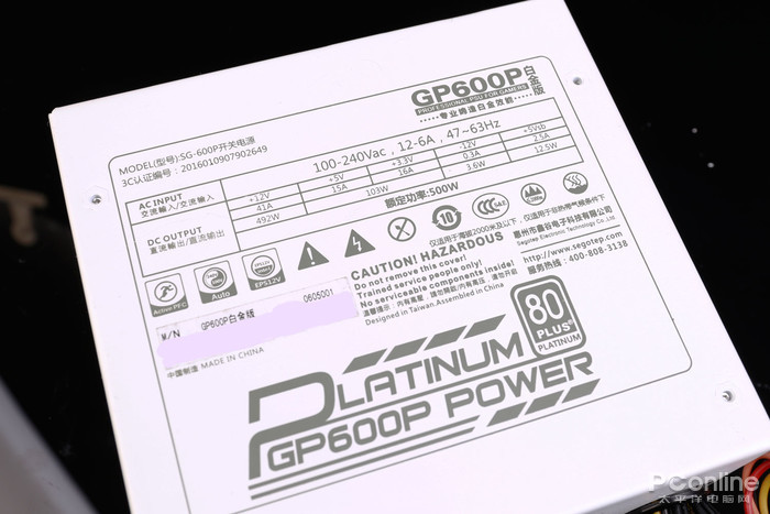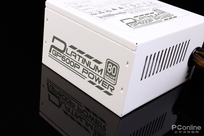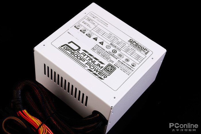 鑫谷GP600P采用纯白外壳设计,在电源一侧印着“PLATINUM”白金,与白色外壳呼应。这个与振华的LEADEX系列一样好看。