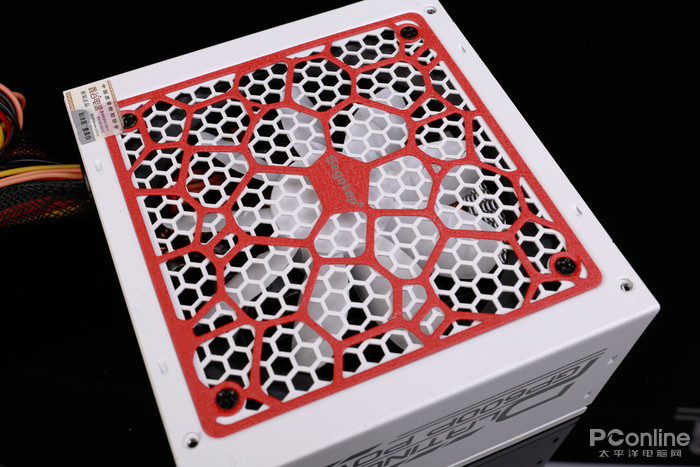 电源进气孔彩虹六角形蜂窝孔设计,在上面加装了红色额不规则网,中间标有鑫谷的英文名“Segotep”。红白配算是标准搭配,外加一个红色网让电源更好看,不过可能会对进风量造成影响。