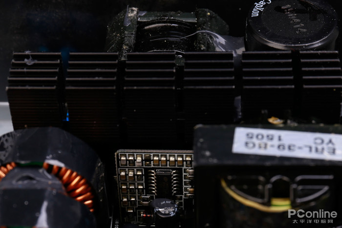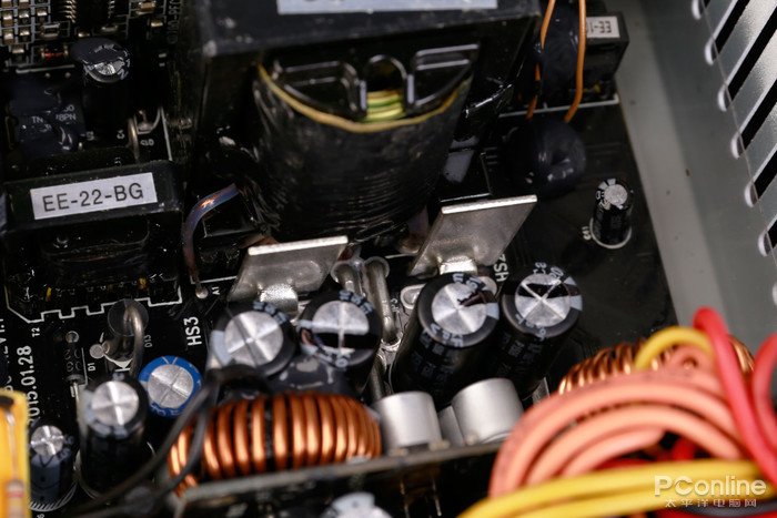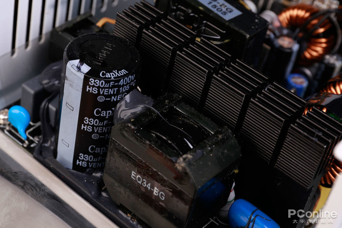 散热片的另一边是PFC线圈和电容,线圈采用密封设计。而电容则是采用台系的CapXon产品,容量330μF,耐温105℃耐压400V。用料也算是次一线的好材料,别忘了整个电源的价格也就300出头。