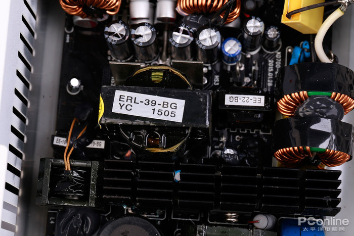 PCB电路板正中间是LLC变压器系统,由两大一小组成,中间的主变压器采用39mm规格。