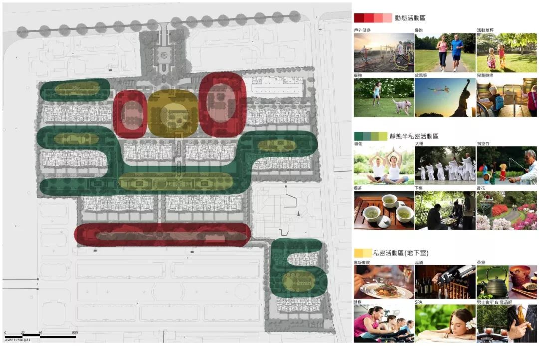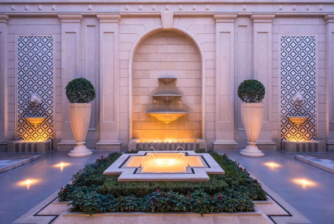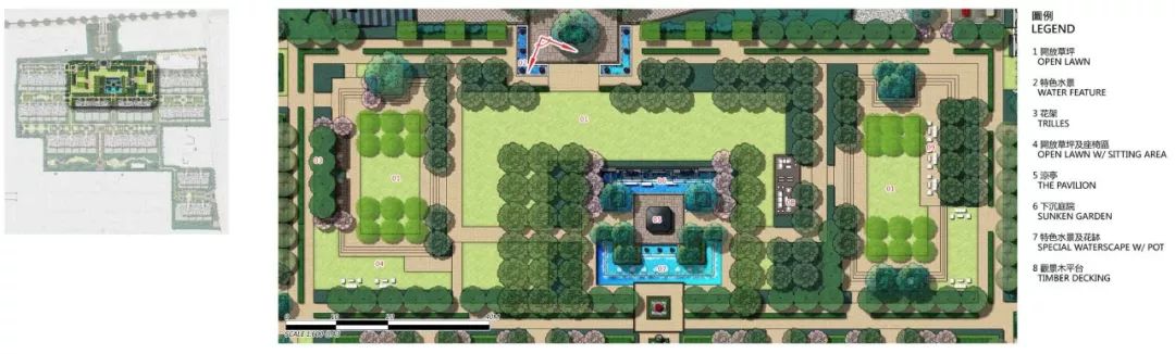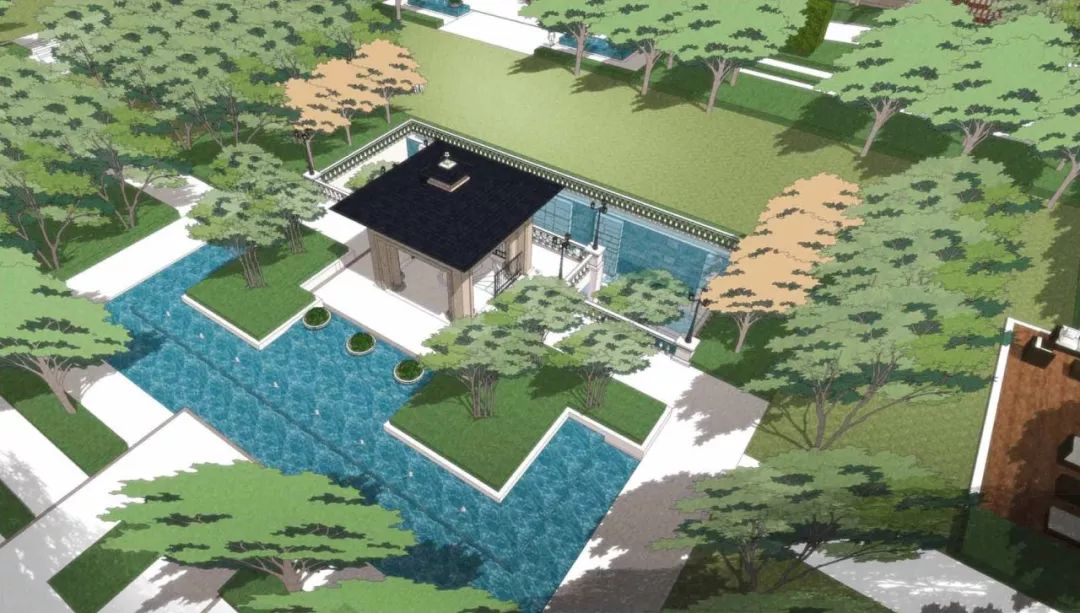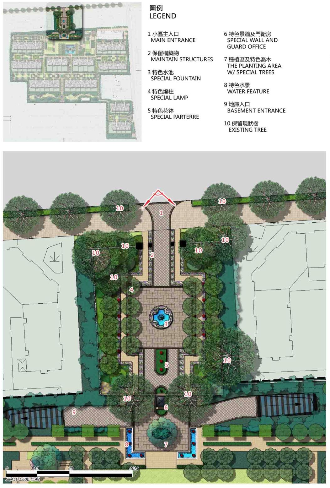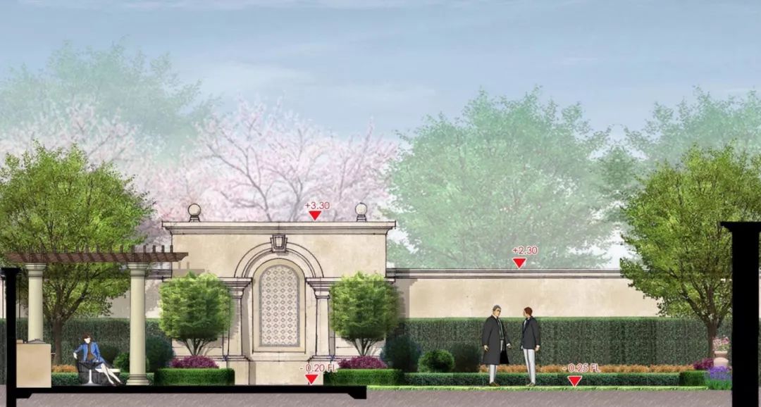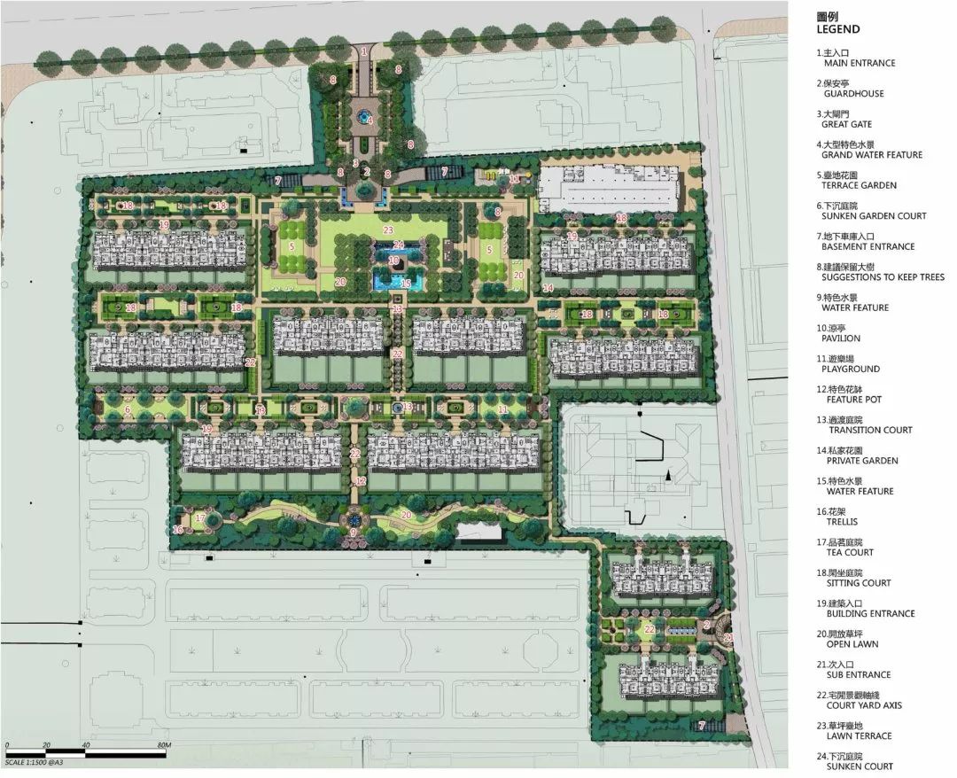 入口道路两侧做了人车分流的处理,法式浪漫的七重景致徐徐映入眼帘,让人放佛置身极富异域风情的法式花园之中。超大面积的中央花园简洁开阔,草坪空间让人豁然开朗。其间以小水景做为点缀,搭配季节花卉,黑、红、绿的搭配让尊贵感散发得淋漓精致。下沉会所呈现出一个隐秘空间。从地面、立面的铺装,到水景、灯光、植物的细致搭配,待到夜晚来临,整个空间将变得金碧辉煌,不乏雅致与趣味。