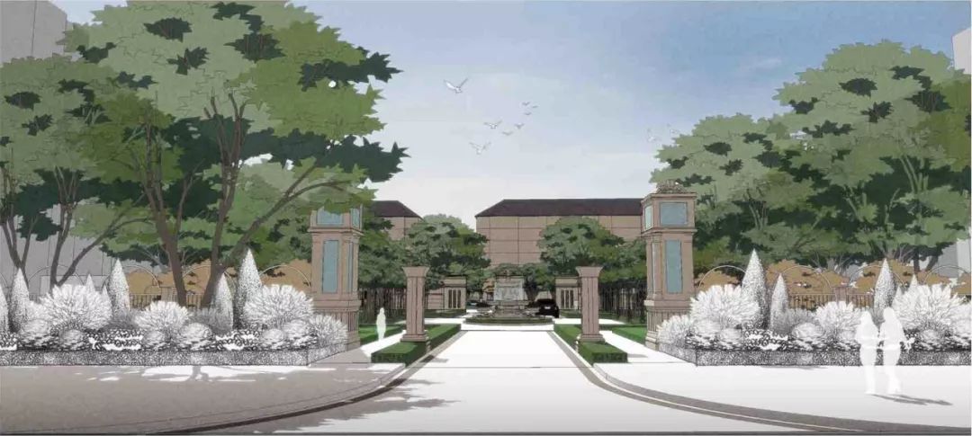 复康路十一号坐落于天津海鸥手表厂故址,比邻南开大学,直面水上公园,东邻天津网球中心,西邻天津图书馆。承法式建筑精髓,将深厚的历史文脉与土地价值融入作品之中,成为见证时间的经典著作。主入口景观为轴对称形式,入口处即可望见中心节点处精致的特色水景喷泉,道路延伸至富有礼仪式和尊贵感的中央台地式花园,整个空间更显庄重礼遇,入口处保留了原手表厂极具标志性的大钟,这不仅是对手表厂精气神的传承,更是对在此奋斗过的几代人的尊重。