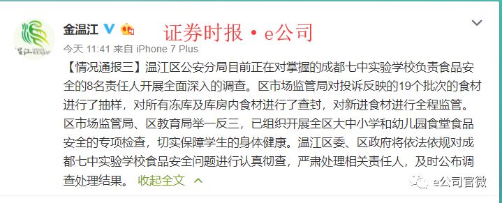 经过3月12日和3月13日凌晨的彻夜发酵,证券时报·e公司记者了解到,现在事件已经有了比较积极的结果。当地政府监管部门已经开始介入调查,涉事的问题食品材料已经被封存送检,学校方面也出台了解决问题的措施,整个事件正在向解决问题的方向发展。