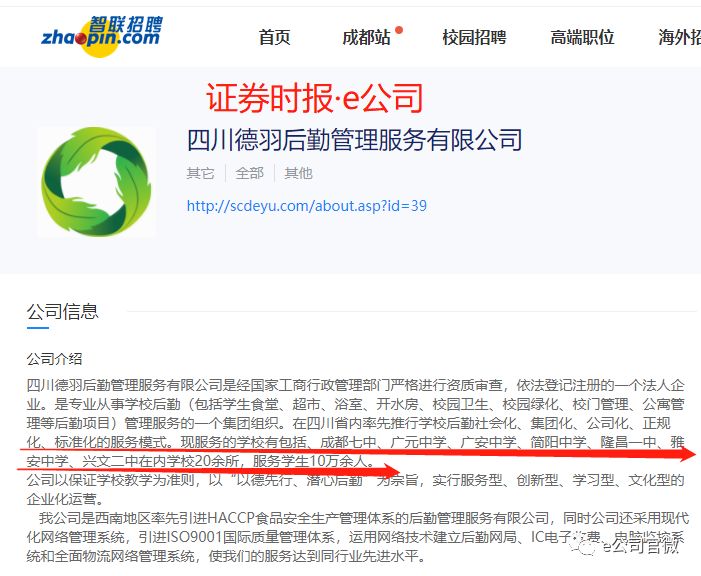 根据四川德羽后勤微信公众号披露,该公司创建于2009年,前身是“四川众呈投资管理有限公司”和“四川宏学教育后勤管理服务有限公司”,于2015年4月合并重组为现在的四川德羽。该公司是专业从事学校后勤管理服务的一个集团组织,在四川率先推行学校后勤社会化、集团化、公司化服务模式,现在服务的学校和企业单位共有30余所,服务学生10万余人。