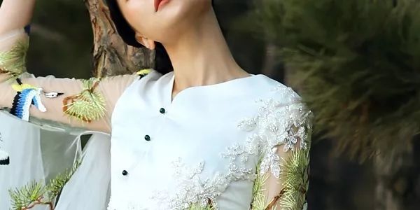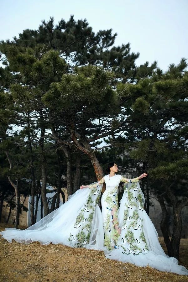 设计师通过面料肌理、精致苏绣、钉珠刺绣,做了许多华丽立体的图案。1200颗钉珠刺绣的蝴蝶,象征自由的鲸鱼,中式传统纹样金鱼,仙鹤,松针,如瀑布的渐变,代表勇气和力量中国神龙,设计师通过国际化的表现手法,融合了中式的传统裁减和西式的立体裁剪,展现出自由飘渺又奢华自由的全新系列。