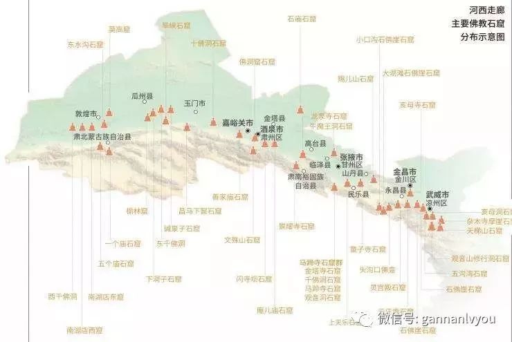 甘肃境内的石窟基本沿丝绸之路,以及古代重要的交通线路分布。根据甘肃石窟的地域特色,可把其划分为河西、陇中、陇南和陇东四个石窟群。这些石窟分布范围广、数量多、延续时间长、内容丰富多彩,代表了中国石窟寺发展演变的基本过程,应该说与敦煌石窟在石窟艺术表现、佛教发展史、历史研究等方面具有同等重要的价值。