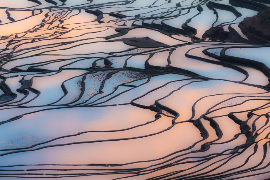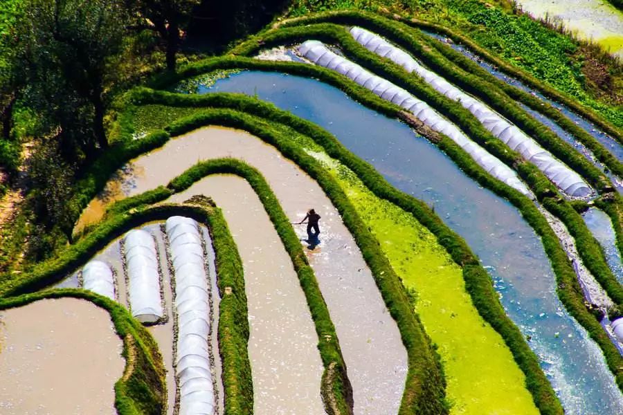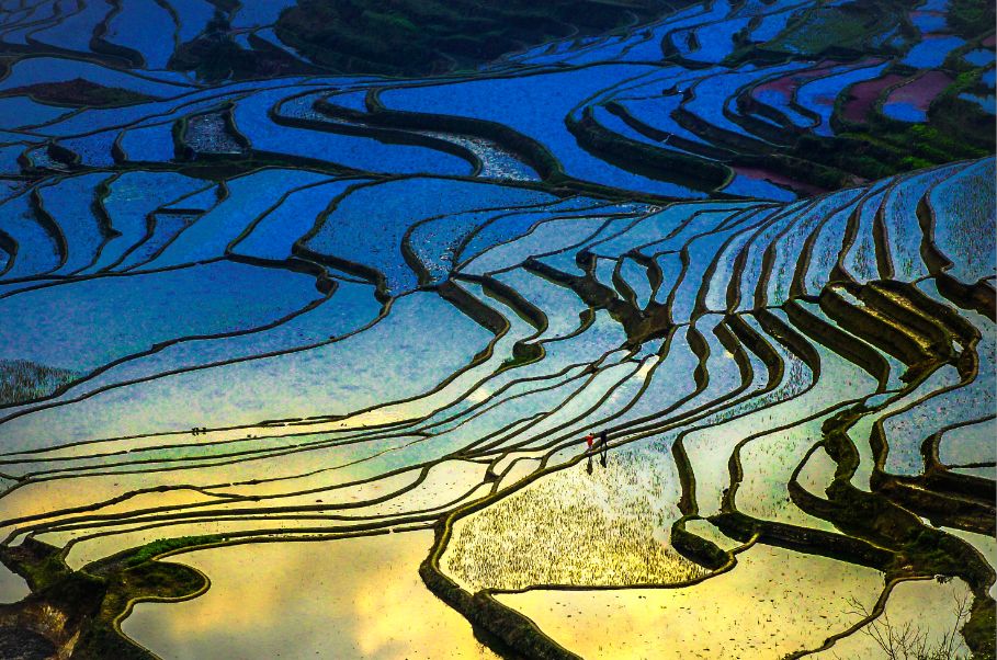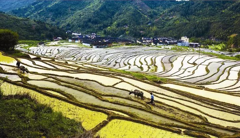 蓝天白云被梯田的水面清晰地倒映出来,层层相叠的梯田,感叹世界遗产的磅礴气势,在夕阳的余晖下,留住醉美的瞬间。人与自然合二为一的美景,自在如此,让人流连忘返,不负余生。