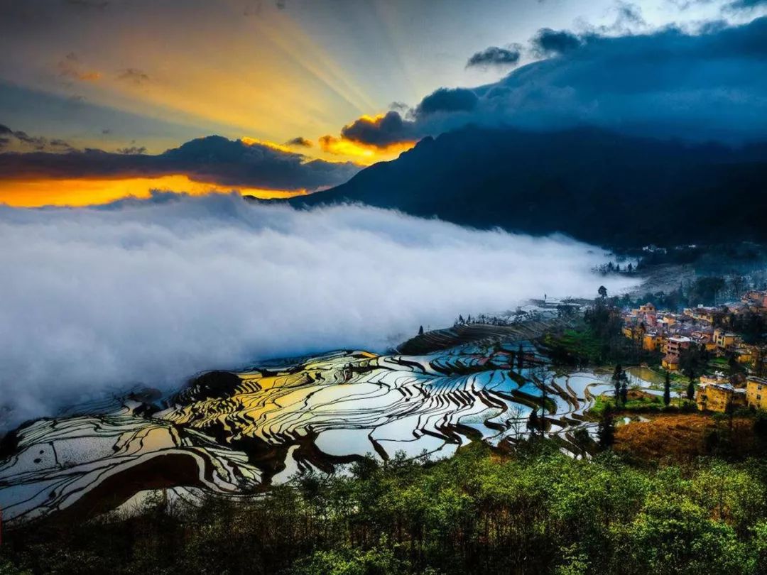 红河哈尼梯田置身于哀牢天地间,融化在自然山水中,呈现出高山、流水、梯田、人家的农业生态景观,云海日出壮阔瑰丽,人与自然天人合一,春如翡翠秋如金的最美画卷,一曲激昂澎湃的天地交响乐。