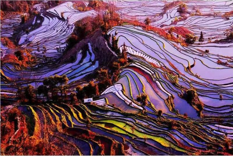 红河哈尼梯田的美是自然生态与文化和谐交融之美,是人与自然和谐的天梯,曾经有人说过,哈尼族梯田是大地的艺术、是大地的雕刻。