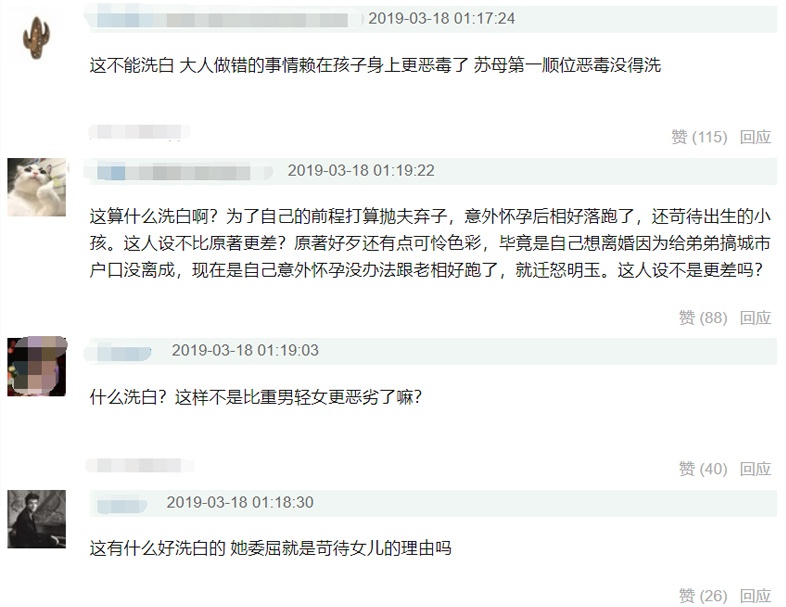 而也有观众认为“什么洗白?这样不是比重男轻女更恶劣了嘛?”“这算什么洗白啊?为了自己的前程打算抛夫弃子,意外怀孕后相好落跑了,还苛待出生的小孩。这人设不比原著更差?”