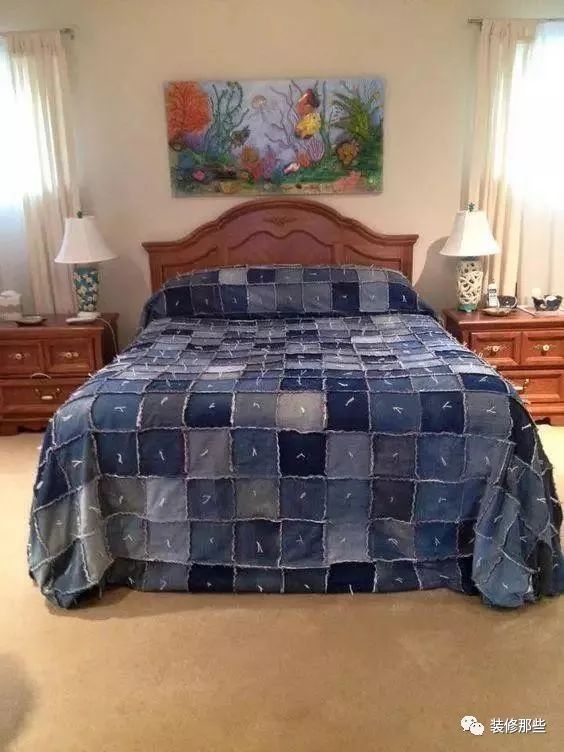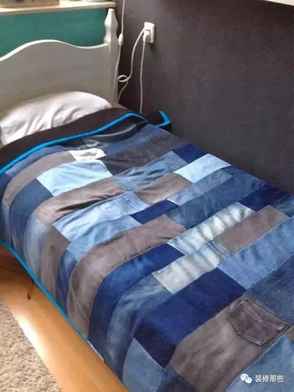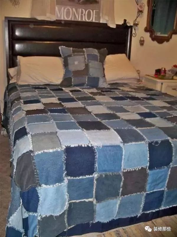 将各种颜色的牛仔衣服剪成相同的大小,然后随意的拼接到一起,按照床的大小,做成床单,是不是格外的有特色,而且牛仔布料比一般的床单布料更加经久耐用喔。