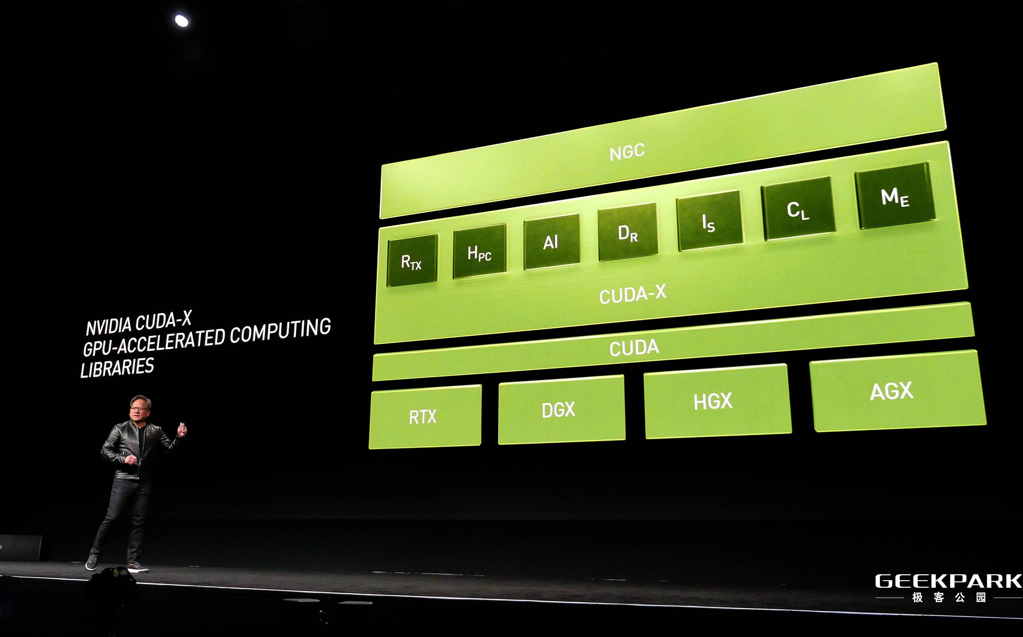 黄仁勋首先发布了统一化的生态系统——全新的 AI 加速计算库 CUDA X AI 库。通过一致的环境,让 NVIDIA 的所有产品都能够实现最大限度的软件加速。计算性能接口的最简化,将极大地加速整个软件和应用的开发工作,显著地简化开发流程。