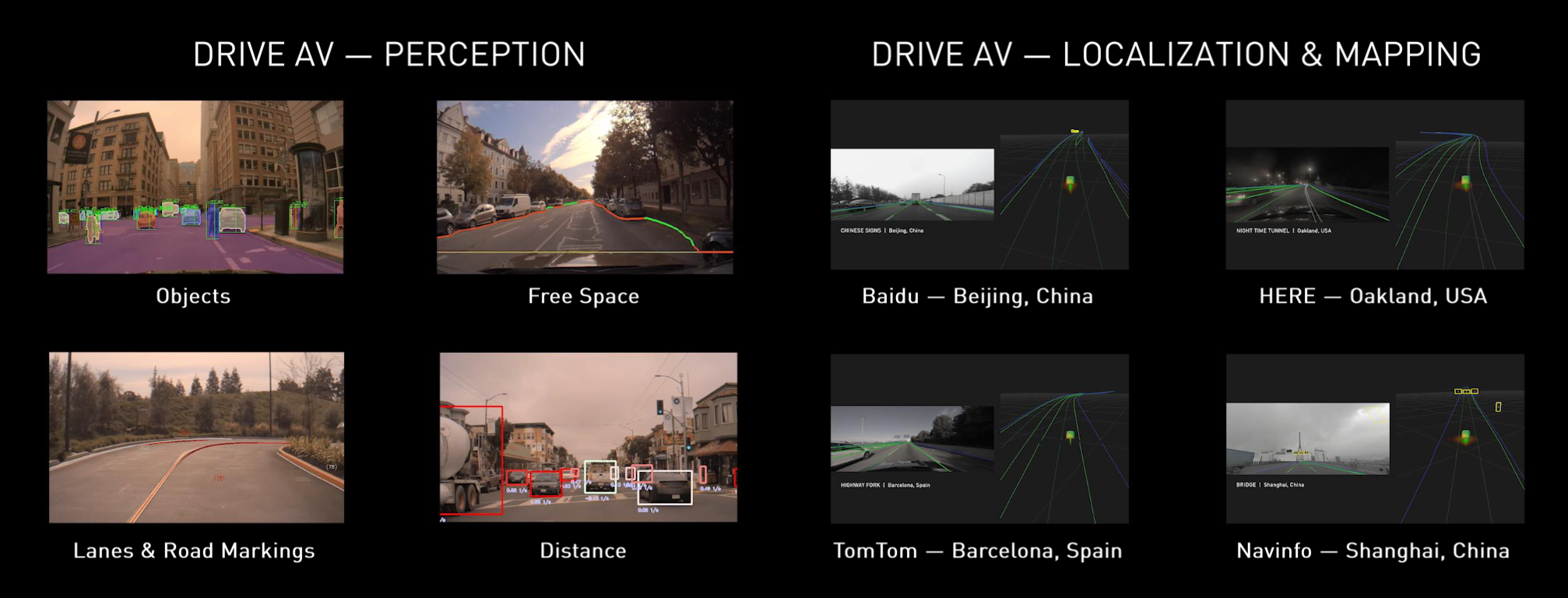 同时黄仁勋演示了 Drive AV 自动驾驶汽车软件套件,这是 NVIDIA 的路线规划系统。它的主要组成部分是 Safety Force Field(SFF)软件,SFF 是通过获取传感器数据来分析和预测周围环境的动态,并确定车辆和其他道路使用者的安全。