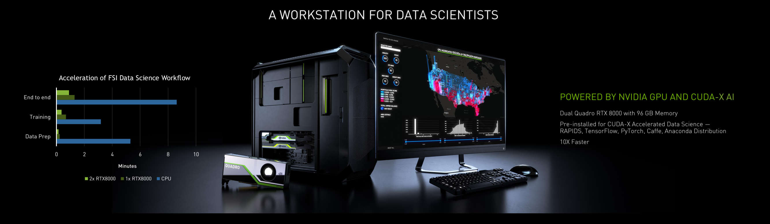 于是英伟达联手合作伙伴推出了面向数百万数据科学家推出全新的高性能工作站。这些工作站基于全新 Turing Tensor Core GPU 和 CUDA-X AI 加速库,该系统专为数据分析、机器学习和深度学习而设计,提供了极强的计算性能和工具,可应对金融、保险、零售及专业服务等领域中的海量数据准备、处理和分析需求。