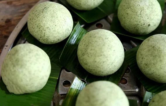 青团上锅前,往往都要在下面垫上粽叶。而蒸青团也是有考究的,差不多15分钟时便要掀开锅盖看一下,一般20分钟就要出锅了,时间久了的青团便会塌掉。打开盖子的一瞬间,艾香扑鼻而来,闻起来神清气爽。