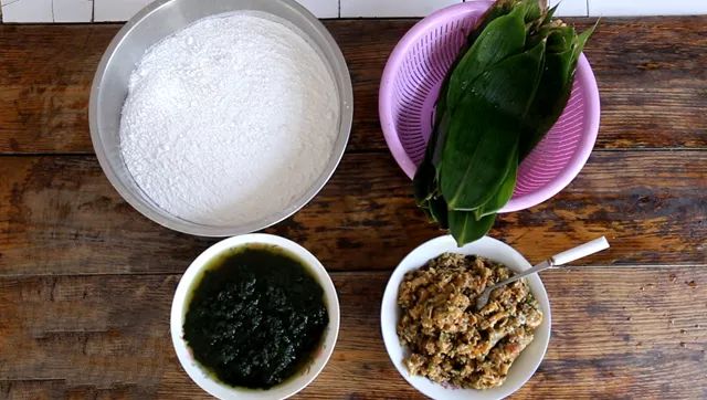 艾青并非采来就可以直接使用,得先处理一下。做团子的时候,洗净的艾青经过揉搓,蒸煮,再倒入糯米粉中,用手反复揉搓,使艾青和糯米粉分布均匀,成鲜绿色米粉团。而揉搓的手法和时间也是很考验功力的,手轻了、时间短了,揉不匀;手重了、时间长了,会上劲,所以,一切都必须刚刚好。