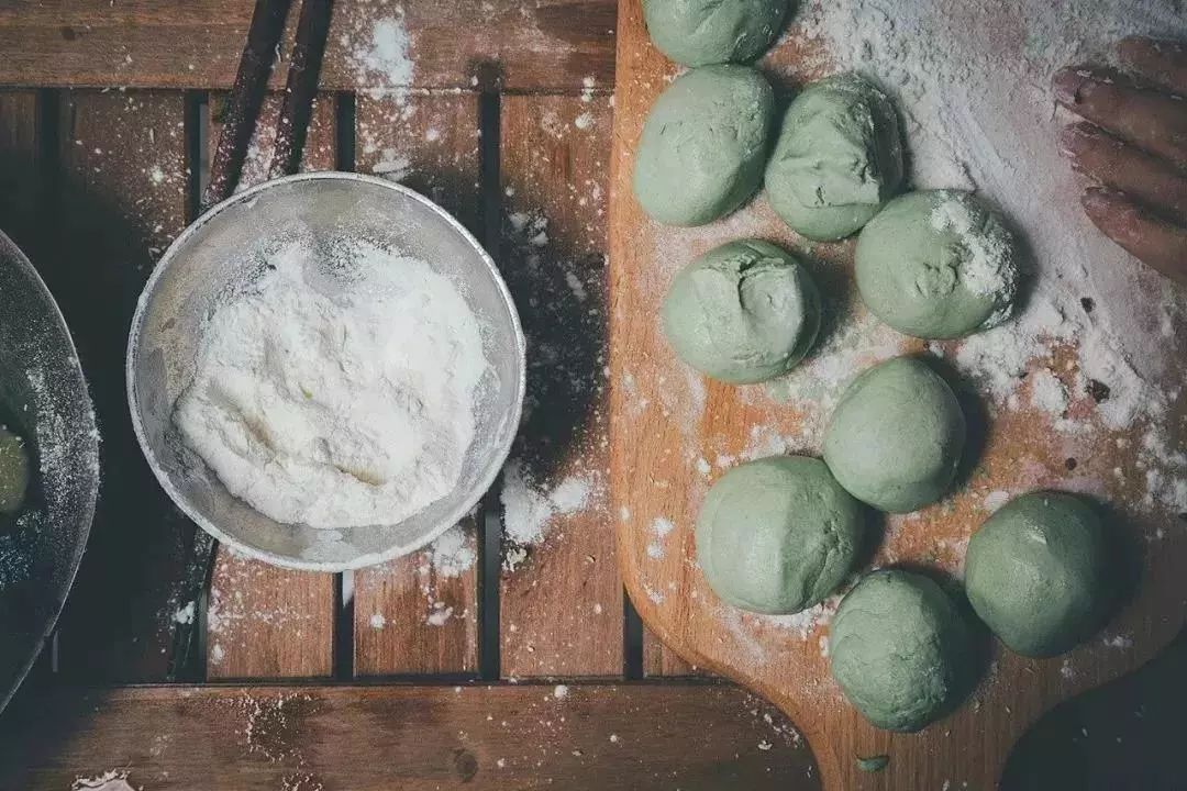 这个过程,往往需要15分钟以上,揉得越久越有嚼劲,吃上去也更加Q弹。揉的时候,再加入一些菜油,出来的青团一个个色泽饱满,看起来很诱人。