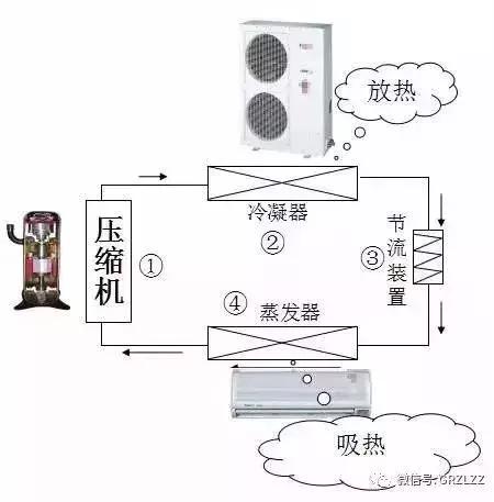 2、将来自压缩机的高压制冷剂蒸气冷凝成液体。在冷凝过程中,制冷剂蒸气放出热量,故需用水或空气来冷却。