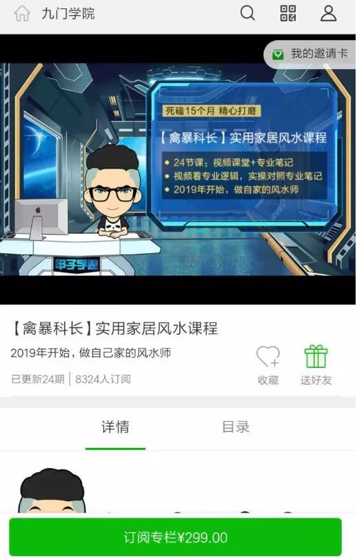 此外神棍局也加入了知识付费业务,其中“实用家居风水课程”售价为299,页面显示已经有8000多人订阅,也就意味着截至目前,仅风水课程,就收入近250万。