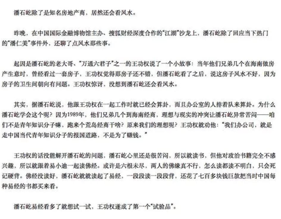 而在媒体的报道中,潘石屹本人似乎也是半个“风水大师”,据称,潘石屹在早期和 “万通六君子” 中的其他几位在海南做生意时便爱读易经,还曾因为会看风水让好友王功权感到惊讶。