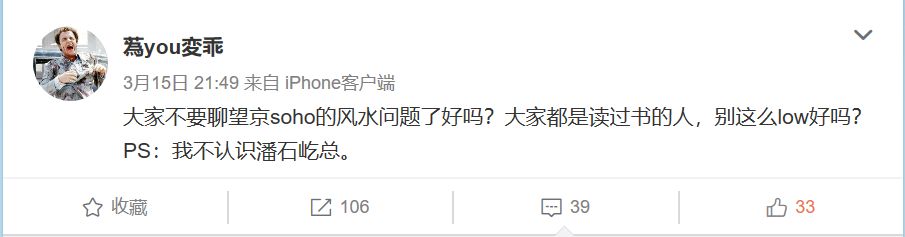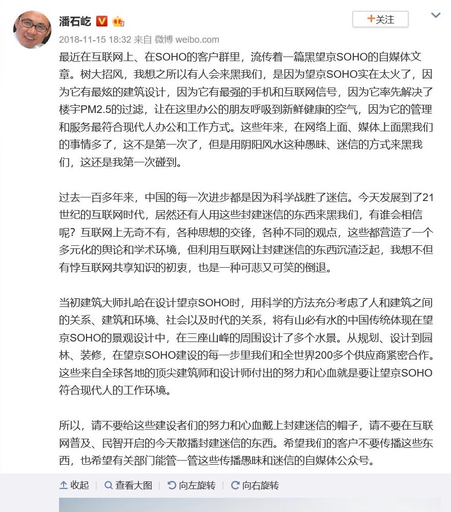 几天后,潘石屹发布了一条长达600多字个人微博,全方位阐述了望京SOHO优良的办公环境,称“之所以有人来黑我们,是因为望京SOHO实在太火了”。最后,还喊话有关部门,“希望能管一管这些传播愚昧和迷信的自媒体公众号”。堪称一篇讨伐檄文。