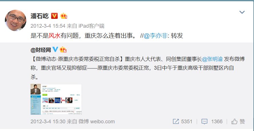 潘石屹的微博中,有多条谈论风水的内容。