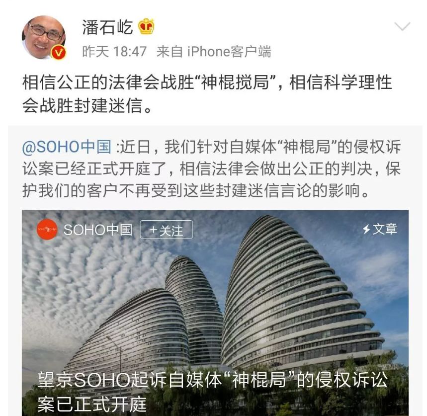 3月18日,望京SOHO起诉自媒体神棍局的侵权诉讼案正式开庭,潘石屹称:“相信公正的法律会战胜‘神棍搅局’,相信科学理性会战胜封建迷信。”