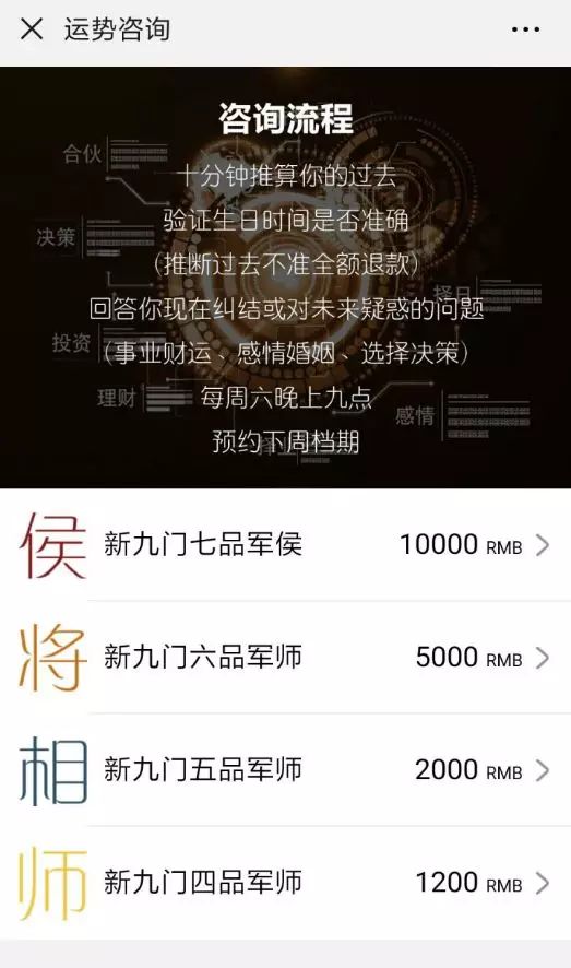 新的公众号上,除了日常更新,预约算命的军师策也保留了下来。而且收费更加昂贵了,最便宜的也要1200元,最贵的命理师收费是90分钟一万元。借助公号内容的导流,每周每个命理师的25个预约号十分钟内就被抢购一空。
