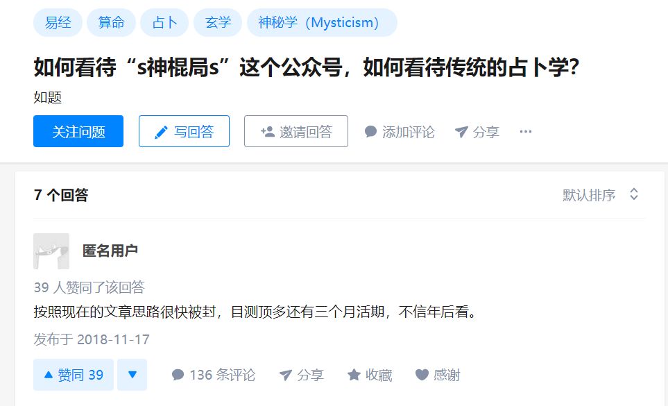 2019年1月18日,“s神棍局s”被封号,旗下另一个公众号“神棍局军师策”同样被封号。