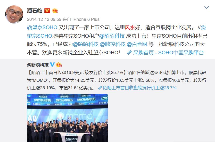 入驻望京SOHO的陌陌上市的时候,潘石屹自己还在微博上说,“望京SOHO又出现了一家上市公司,这里风水好,适合互联网公司发展”。
