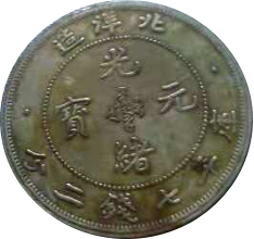 钱面:珠圈内满汉文“光绪银元”,上环“北洋造”, 下环“库平七钱二分” “光绪元宝”四个字,字体俊秀。 [光]字最后一笔竖弯勾,做了一个鸟的造型,鸟嘴紧连[光]字一瞥。 的[绪]字中间那一瞥,仿佛刀柄,一刀刺进了[绪]字的心脏。[元]字,锤击鸟眼,有吸干大清元气之意。 [宝]字的宝盖上面一点,探出宝盖下方,字体写的柔弱飘逸。