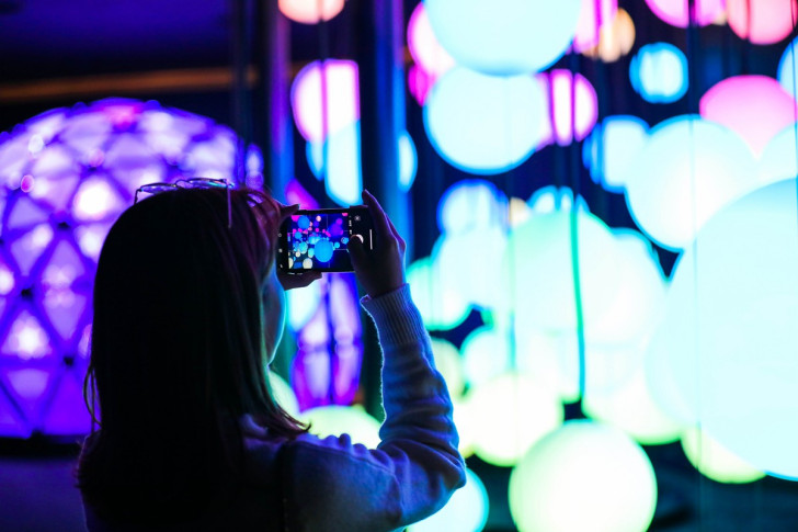 以“感触光影”为例,在这里,你轻轻碰触圆球,圆球就能发出不同的色彩,在提供了一个充满艺术感的拍照环境的同时,还大大提高了顾客的参与感;再比如“光影印象”,在这里你可以挥舞发光棒,通过内置的相机记录你的精彩一瞬;再比如“感知音乐”,这一个密封的房间内布满了光影变幻的灯柱,每一个灯柱前都摆着一台vivo手机,通过点击手机屏幕的音乐元素奏出斑斓色彩。